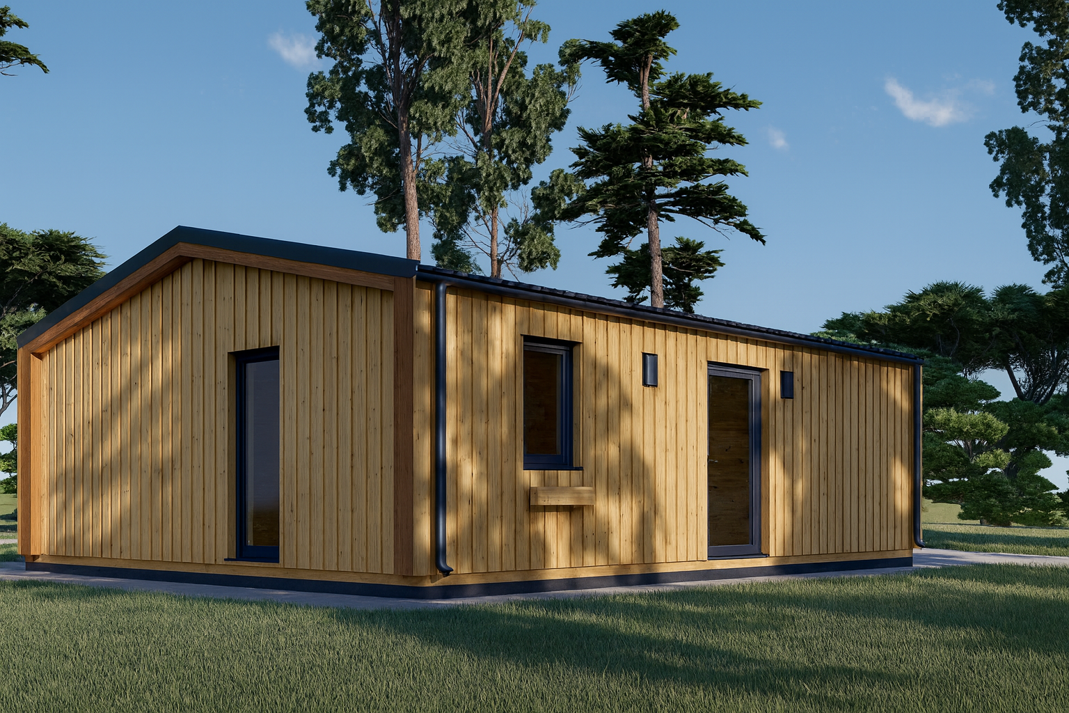 Die hochwertige Holzverschalung verleiht ANGELIKA einen exklusiven, zeitgemäßen Look und sorgt für einen eleganten Auftritt im Garten oder auf dem Feriengrundstück.