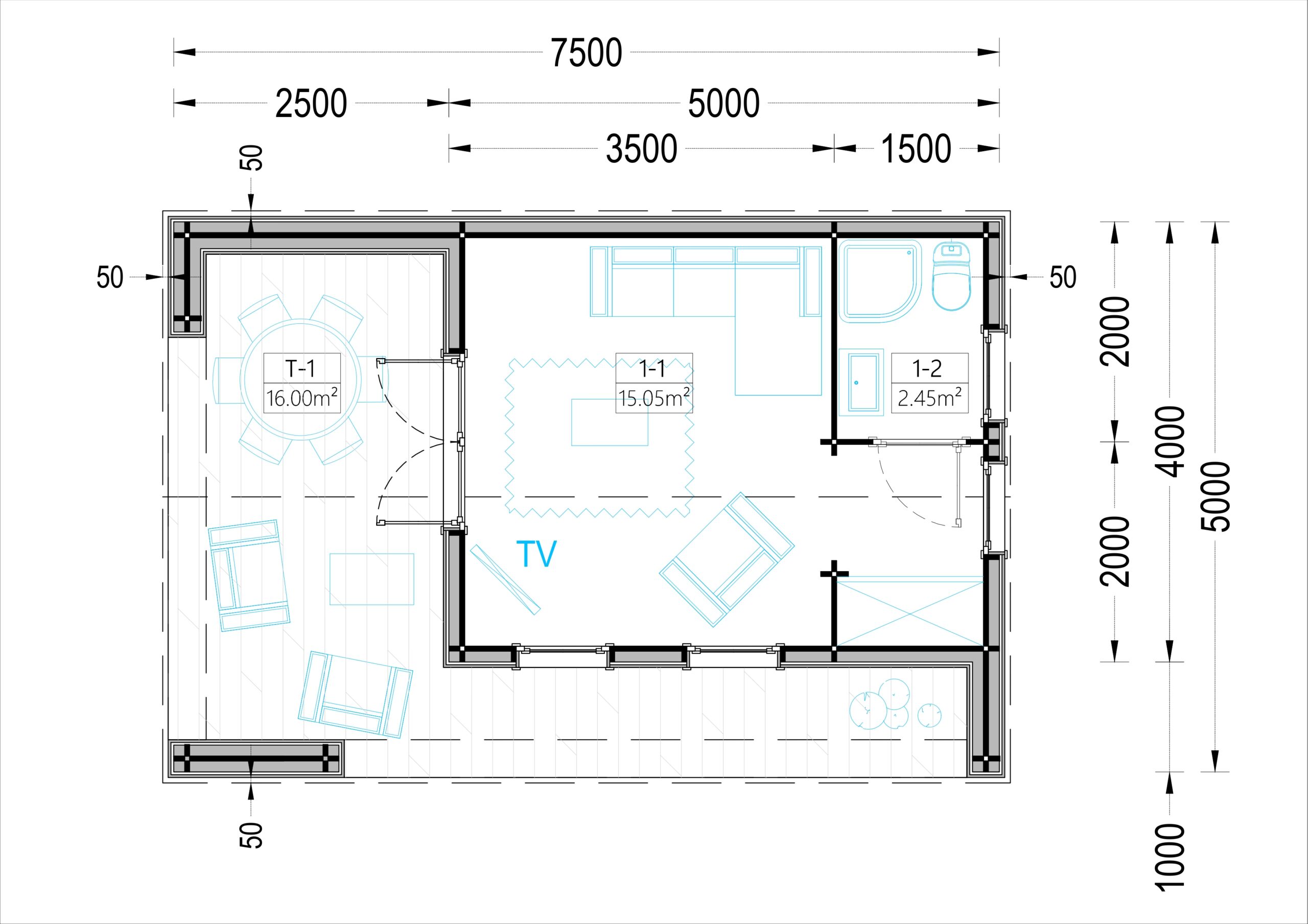 Blockbohlenhaus MILAN Modern (44 mm + Holzverschalung) 37 m²