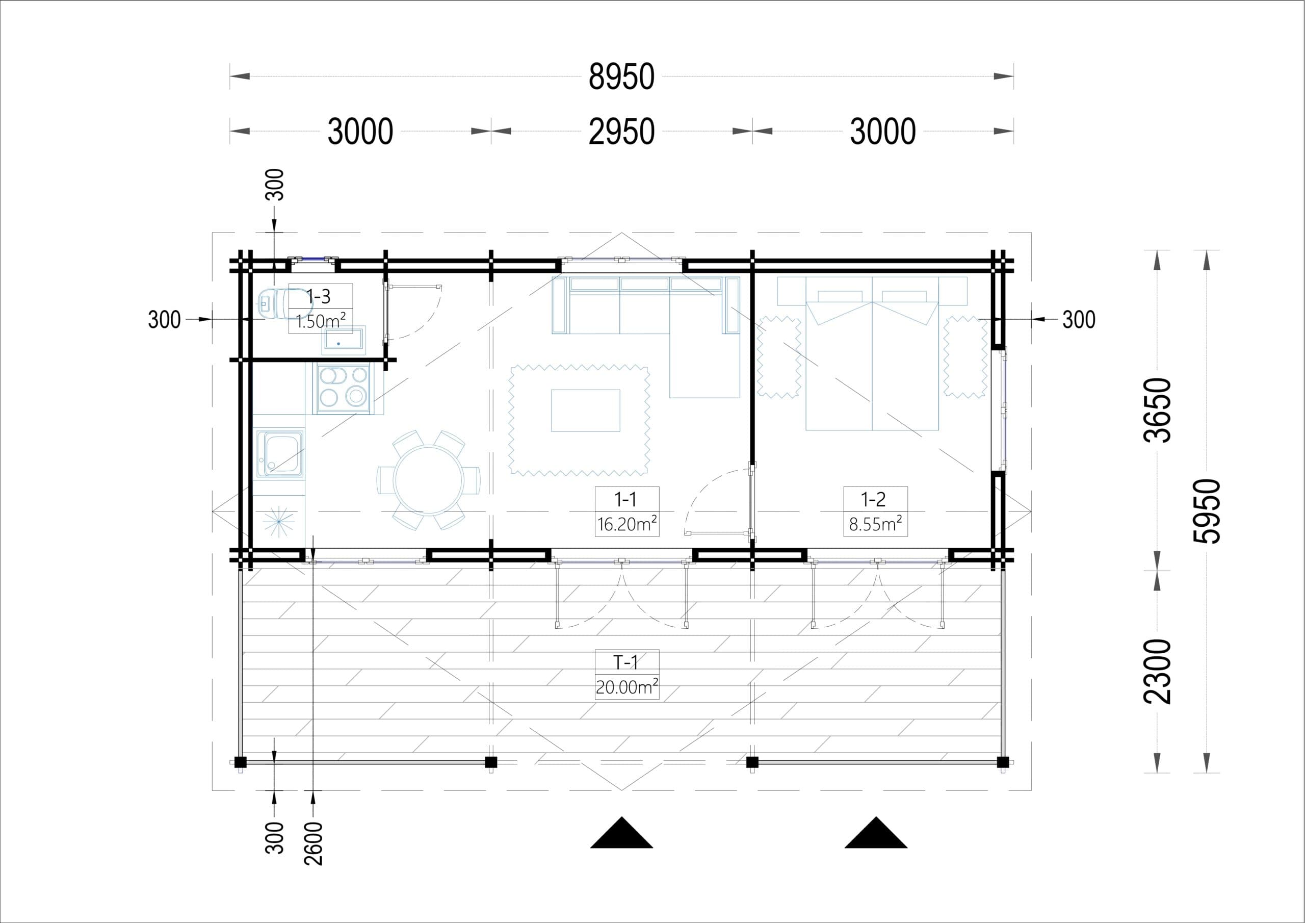 Willkommen im Blockbohlenhaus LILLI – einem charmanten, kompakten und funktionalen Holzhaus mit 44+44-mm-Doppelwandkonstruktion, 32 m² Wohnfläche und einer großzügigen 20 m² überdachten Terrasse.