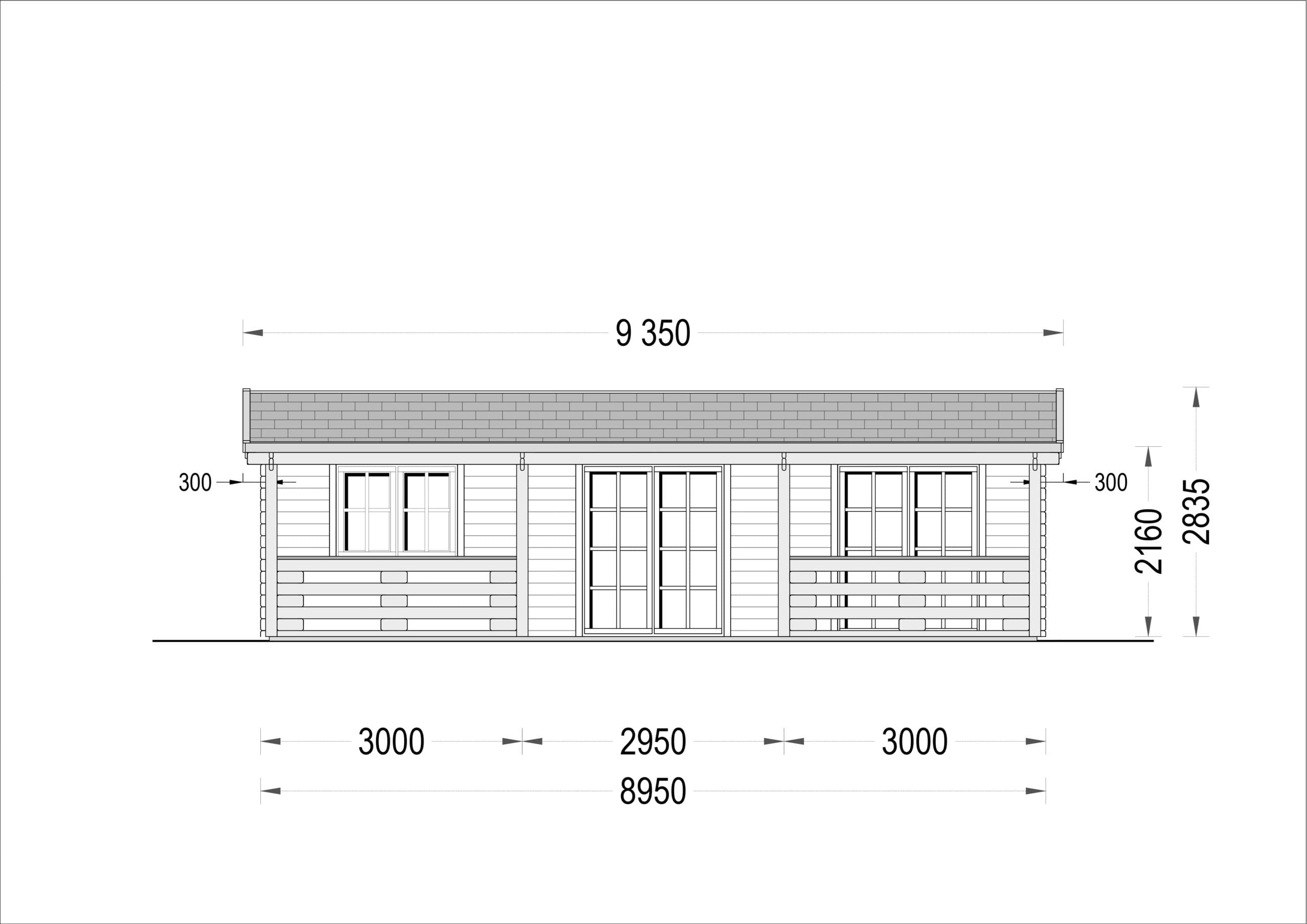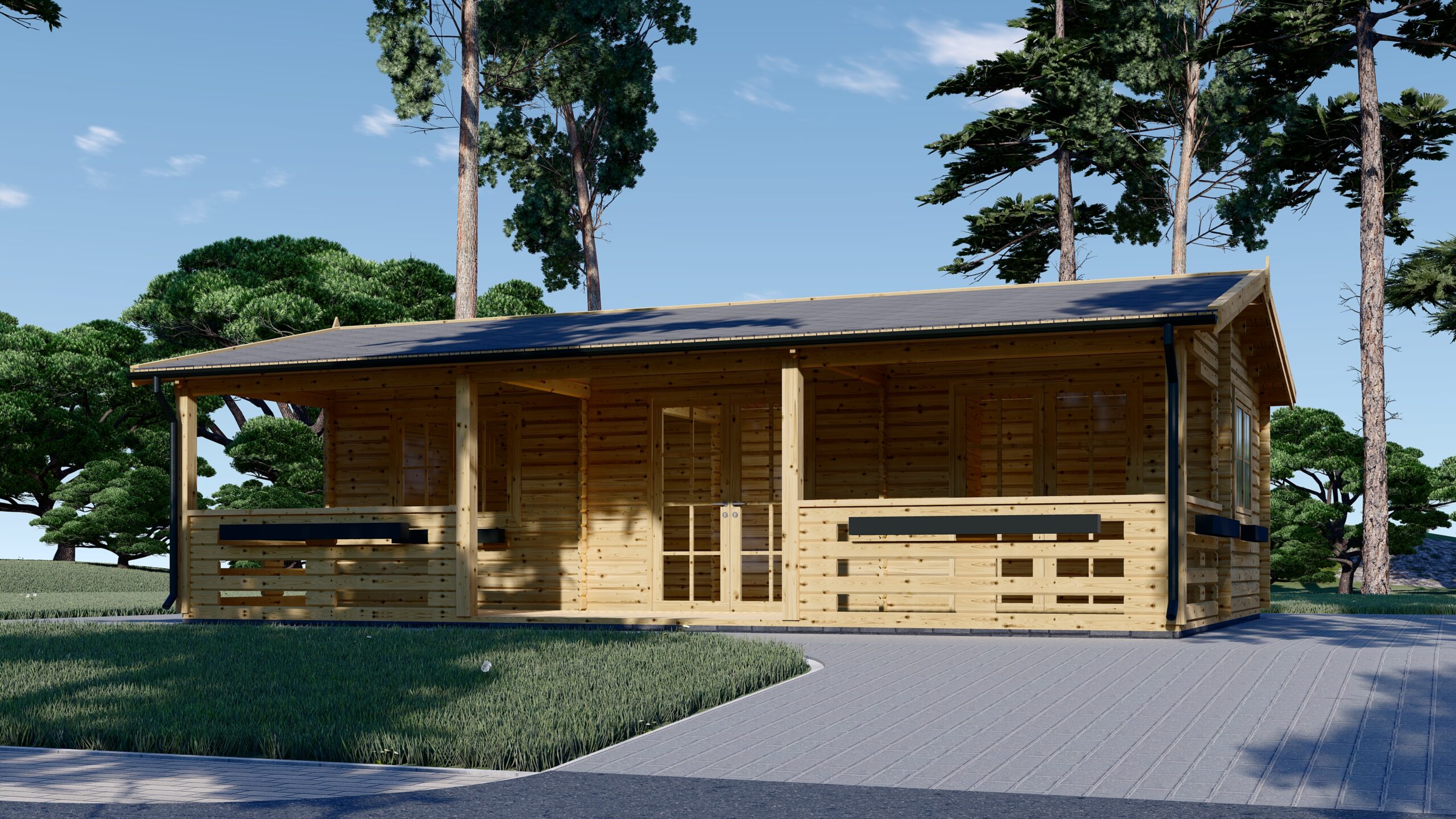 Blockbohlenhaus LILLI (44+44 mm) · Isoliert · 32 m² + 20 m² überdachte Terrasse