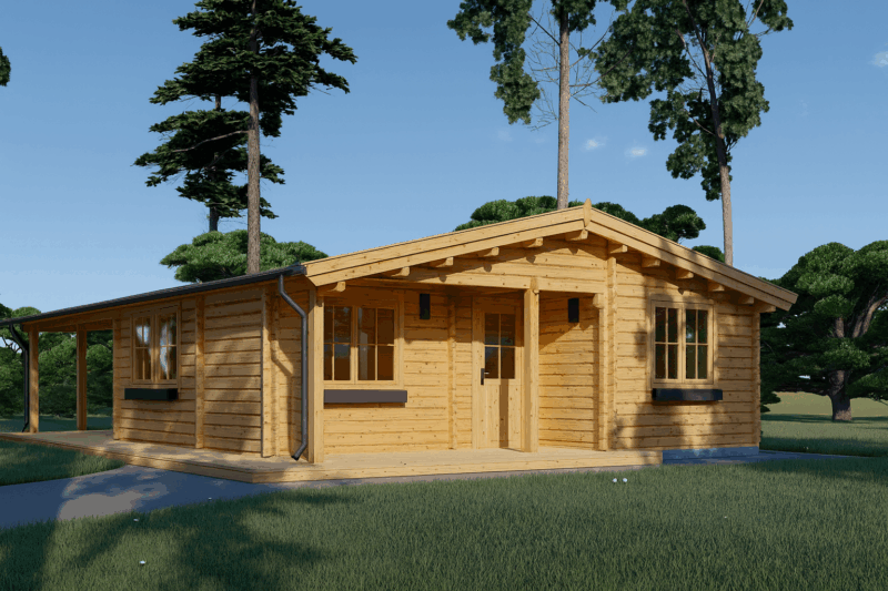 Blockbohlenhaus DORNBIRN (44+44 mm Isoliert) · 20 m² + 16 m² Schlafboden · Pultdach