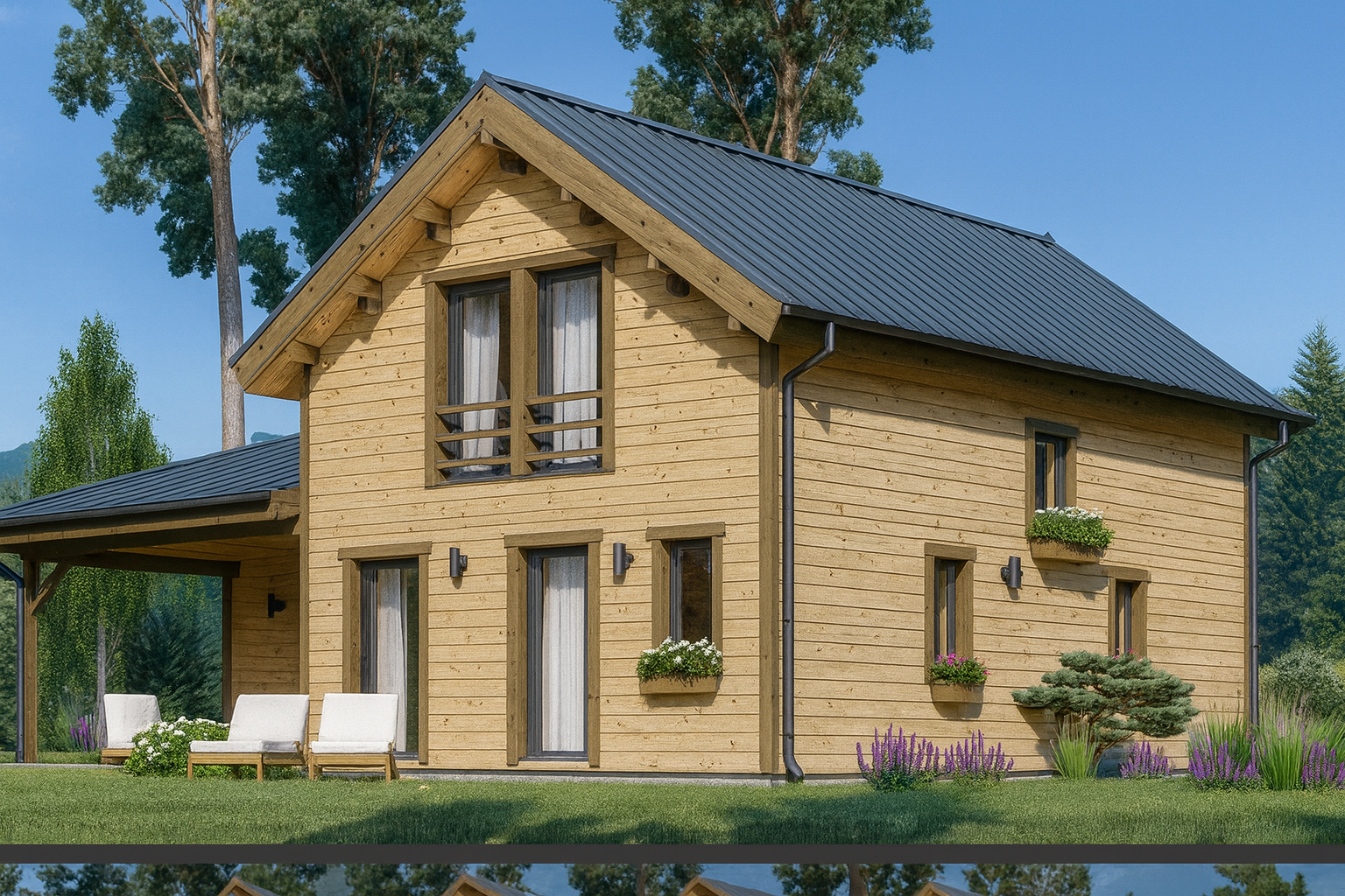 Mit einer Wohnfläche von 150 m² und einer isolierten 66-mm-Holzverschalung bietet dieses Modell ausreichend Platz für Familien, Gäste oder jene, die im Grünen ein vollwertiges Eigenheim schaffen möchten.