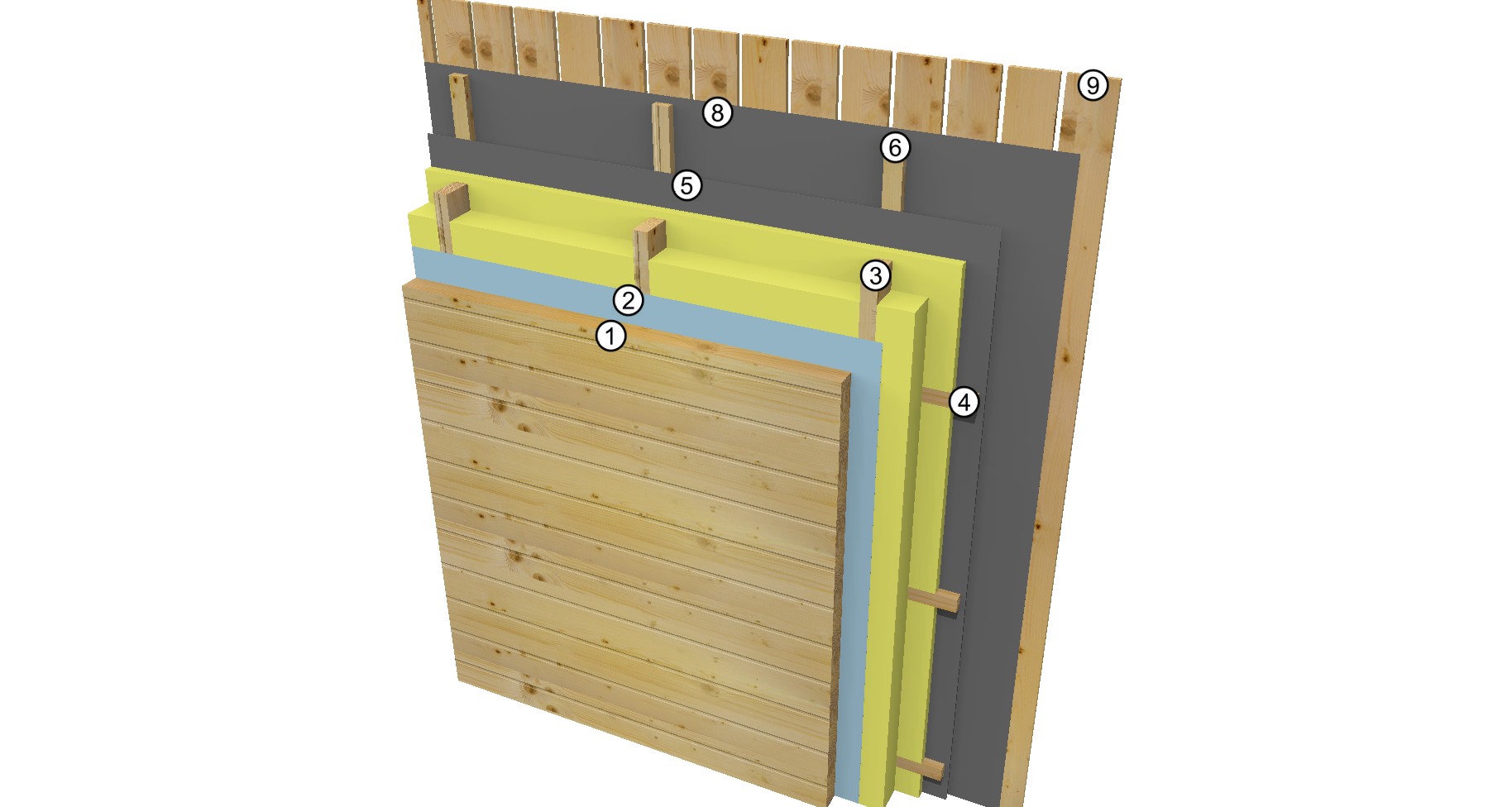 • Wandisolierung: 130 mm System mit Holzverschalung