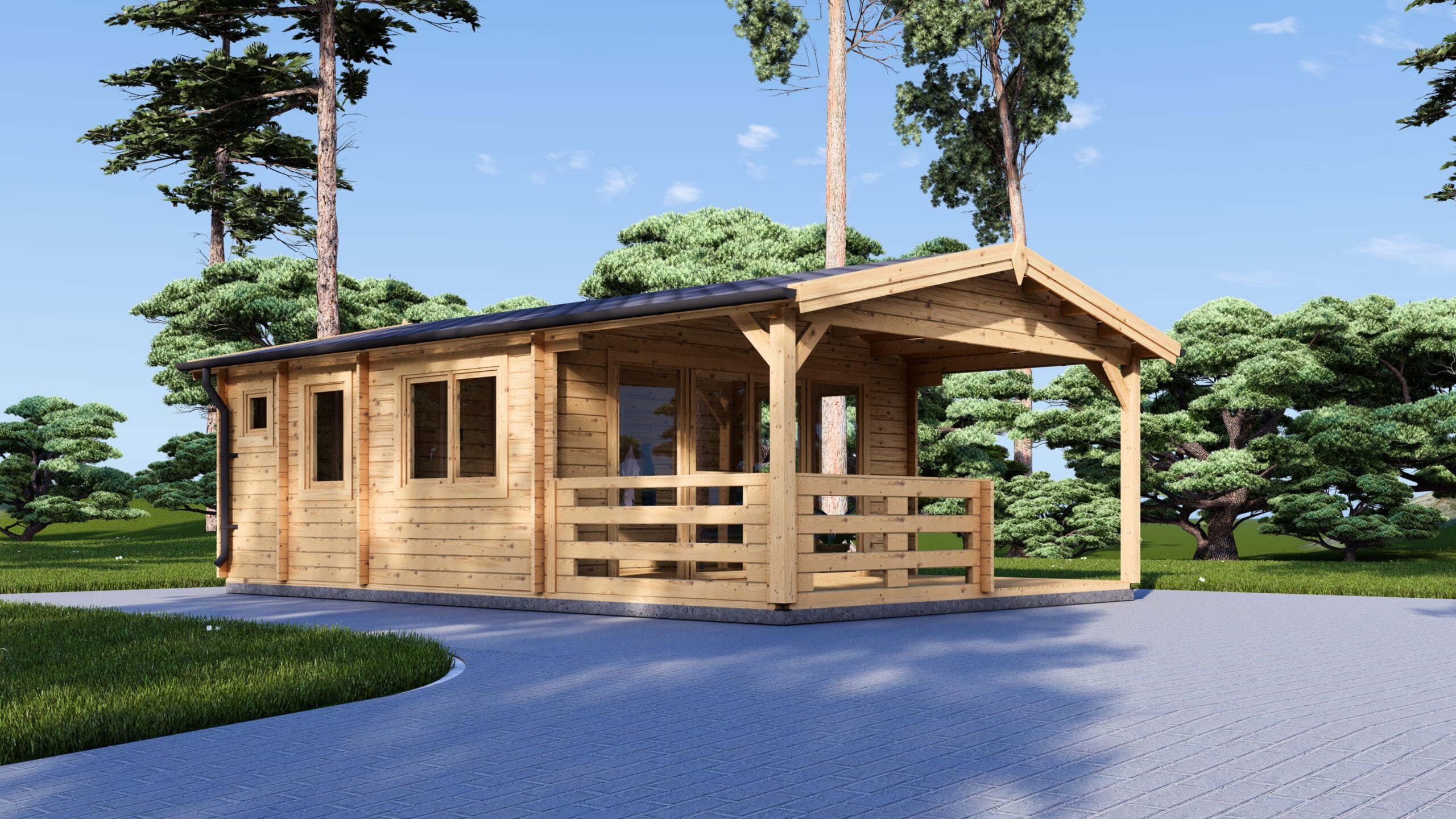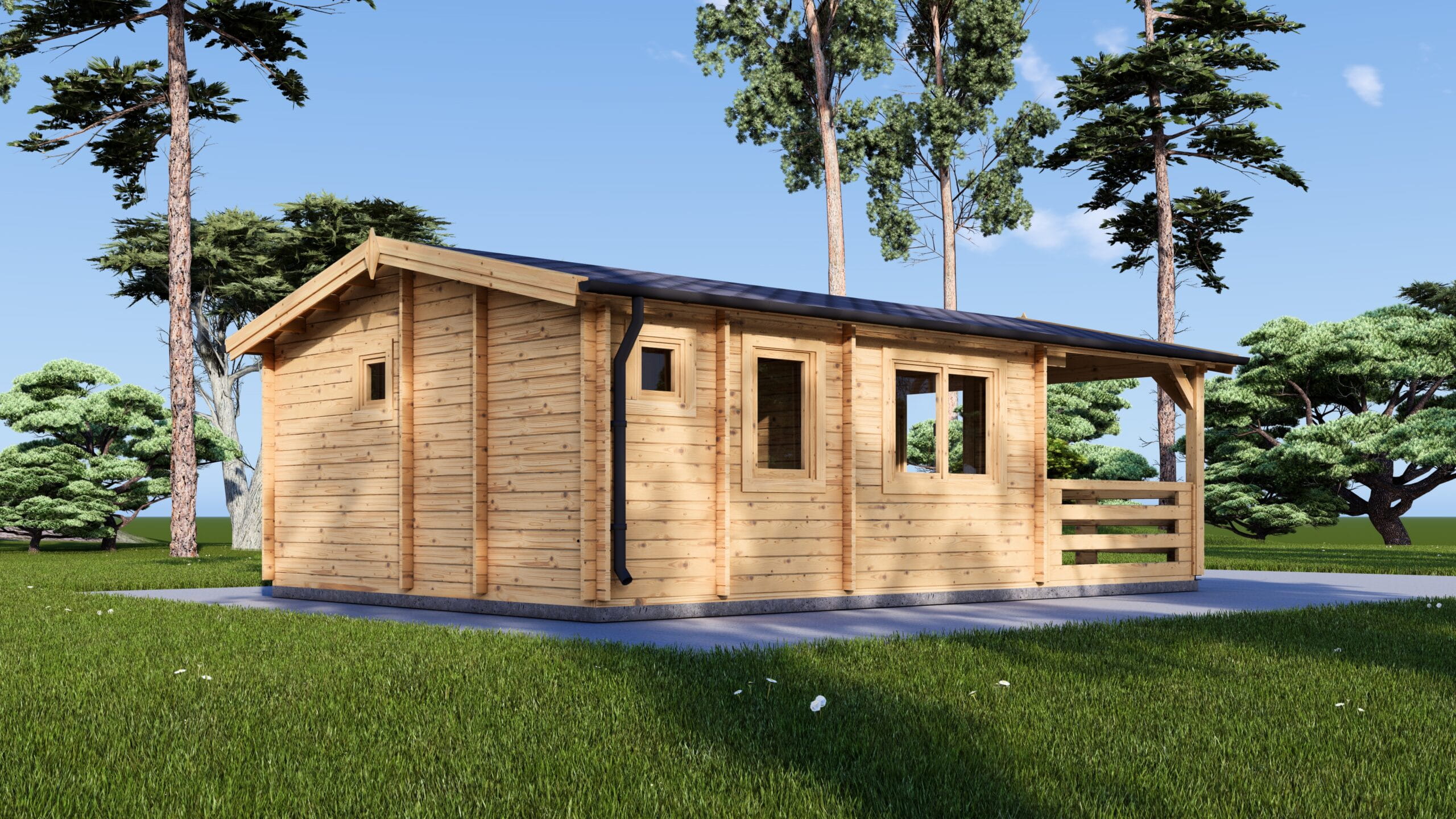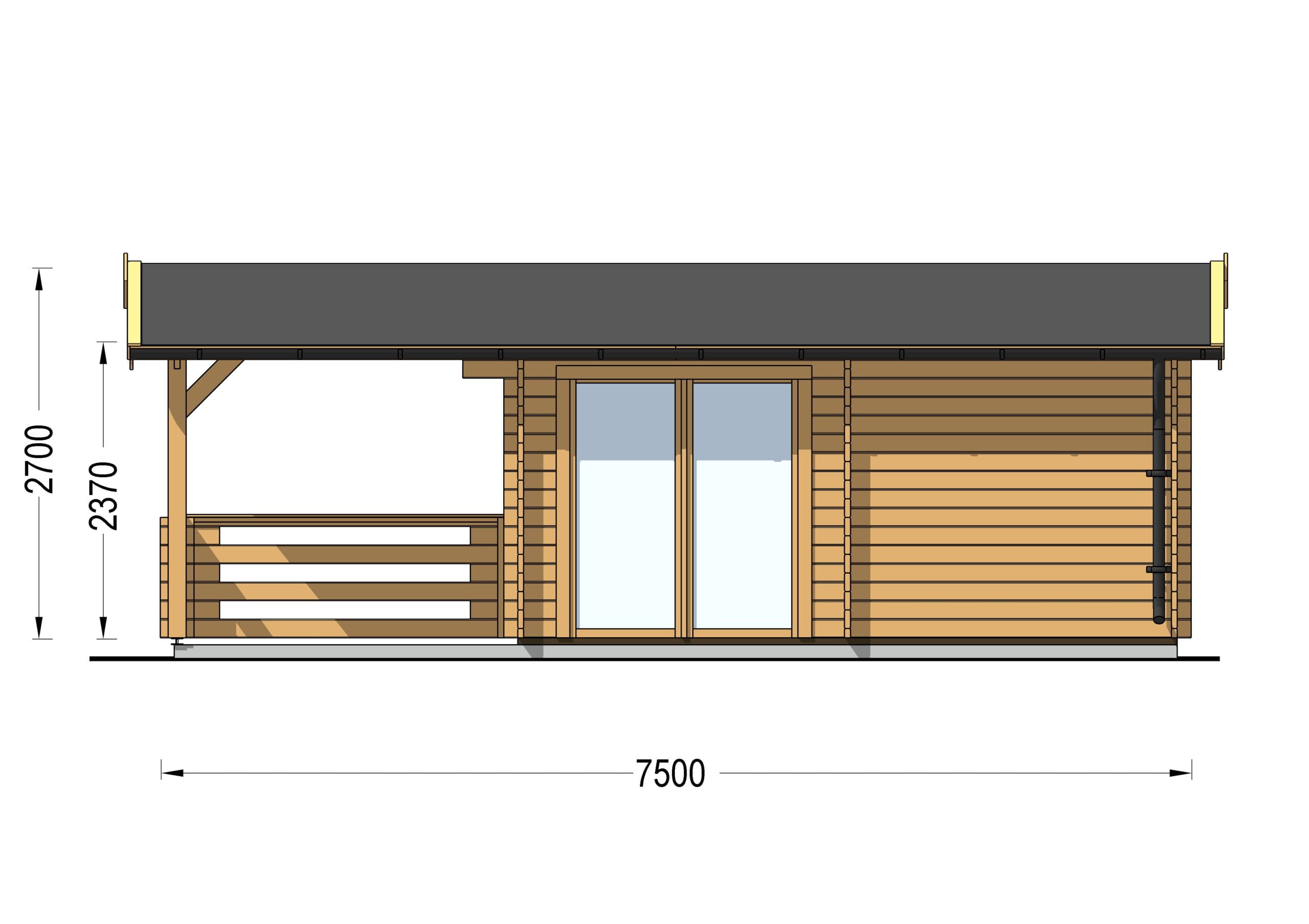 Saunahaus Helga (44 mm), 5×7,5 m; 25 m² mit Terrasse 12 m² (4 Räume)